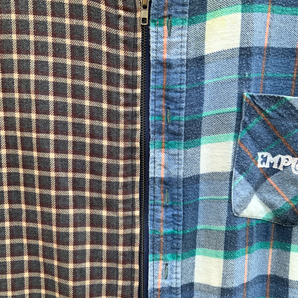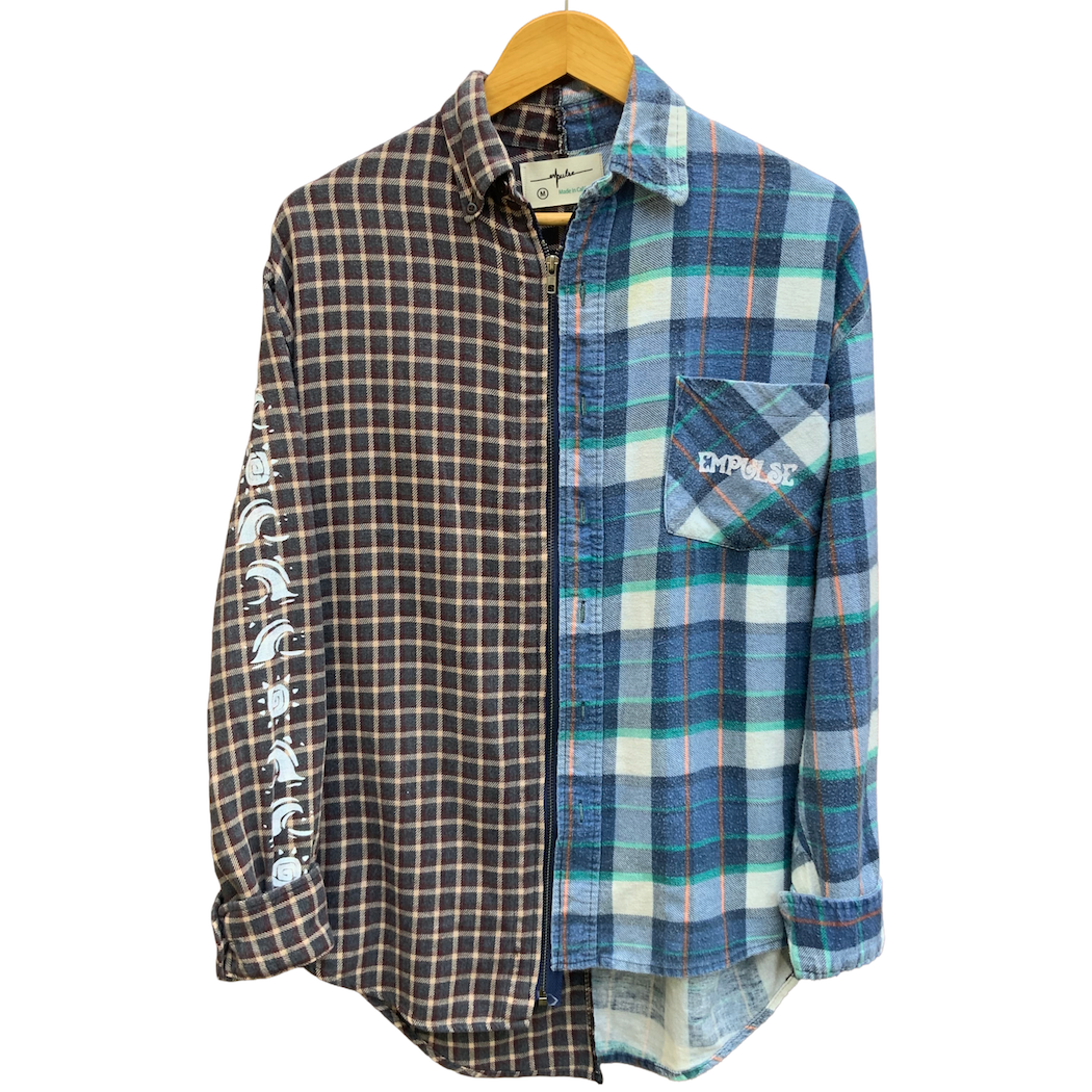 Show off your unique style in this limited edition Zip Split Flannel! This up-cycled style is my original design and was handmade in San Diego. Original retro sun wave art is hand printed on the sleeve and eMpulse logo is printed on the chest pocket. Split flannel sides on front and back, featuring an blue flannel side and charcoal/cream/burgundy flannel side.